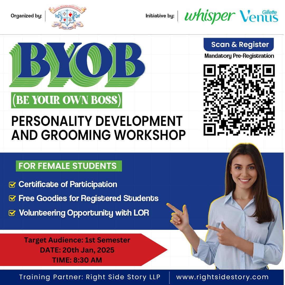 P&G (Whisper & Gillette India), in collaboration with Right Side Story LLP, organised a transformative and thought-provoking workshop titled “Be Your Own Boss” (BYOB) at Loreto College, Kolkata on January 20 and 22, 2025, for Semester I and Semester III students, respectively. The workshops were facilitated by Ms. Disha Ganguly, with assistance from Ms. Baondana Mondal and Ms. Titas Ghosh Chaudhury of Right Side Story LLP. Ms. Ganguly’s engaging and inspirational approach to conducting the sessions left the students motivated and deeply impacted.