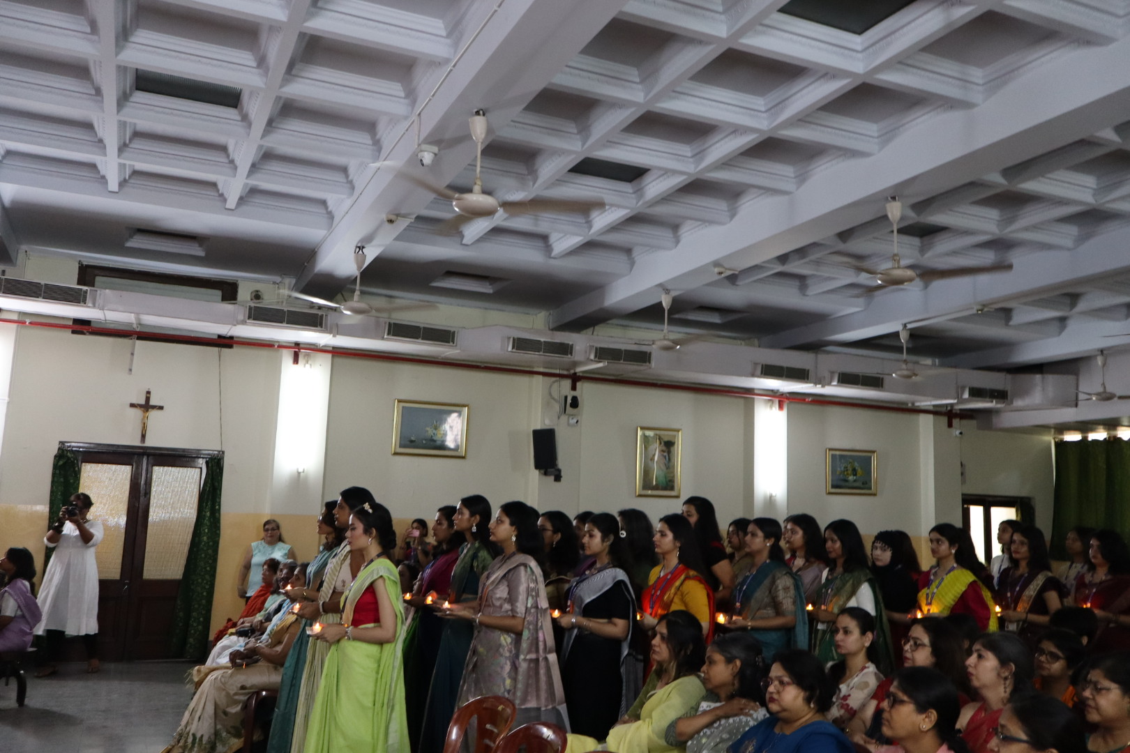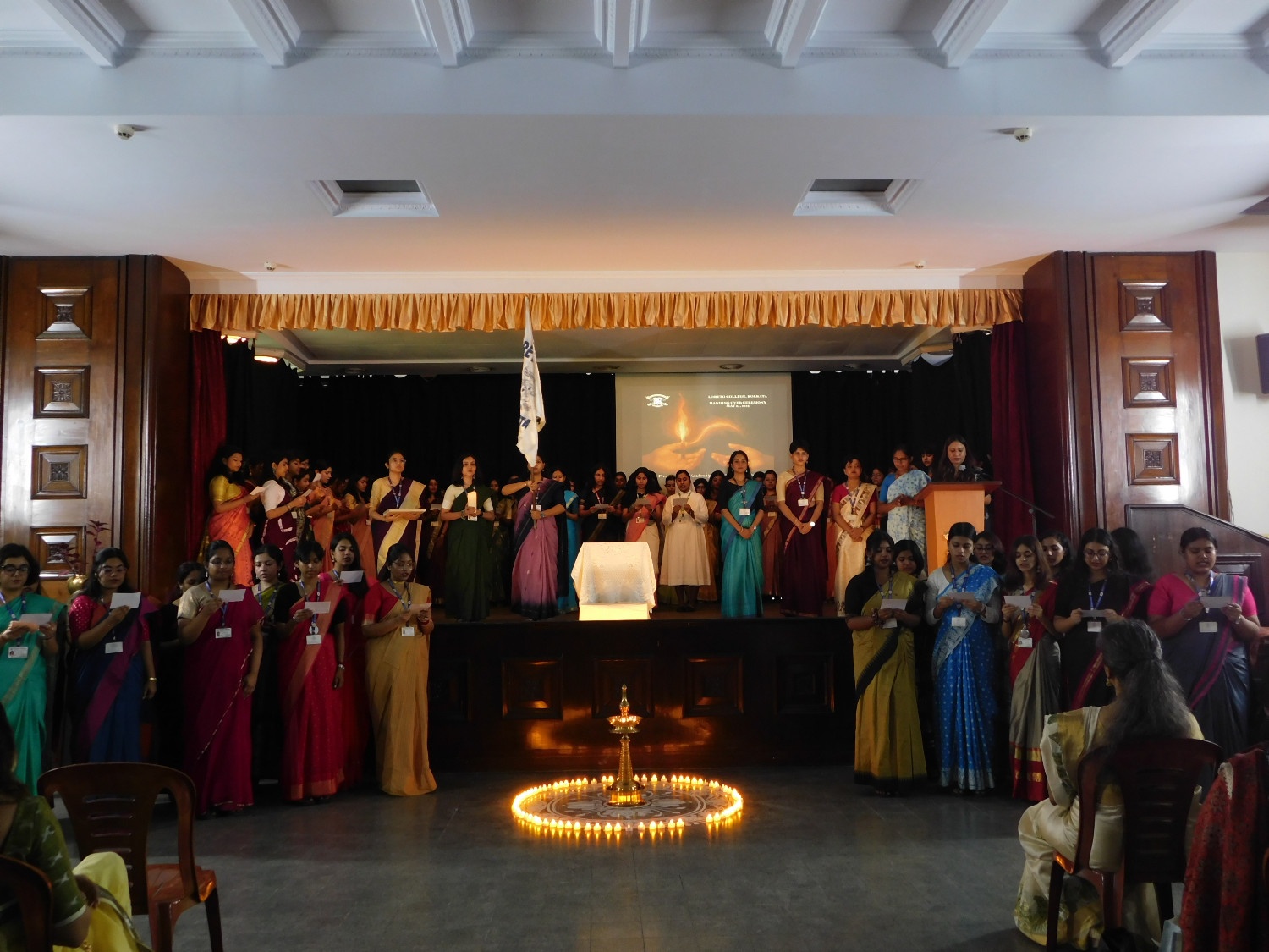 The Handing Over Ceremony of the Loreto College Student Council (2024–2025) was held on 24th May, 2025, with the theme "From Legacy to Leadership - The Flame Lives On." The event began at 10:00 a.m. with soft instrumental music as faculty members, students, and parents gathered in anticipation. The ceremony commenced with the traditional lighting of the lamp by Sr. Dr. A. Nirmala, Chief Guest Dr. Charlotte Simpson Veigas, and senior faculty member Mangala Chakravarty. A symbolic candle walk followed, during which each Student Council member placed a candle around the lamp as the names of each society’s President, Vice-President, and Treasurer were announced.