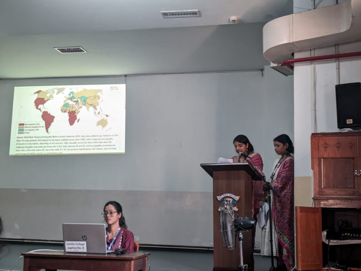 The first research group,composed of Snigdha Banerjee and Koyena Roy worked under the guidance of Dr. Suparna Ghosh. Their paper, "Analysis of the Luxury-Need Hypothesis from C.1400 CE to C. 2000 CE," explored the dynamics of wealth accumulation and survival desires across social classes. By examining the Luxury-Need Hypothesis over six centuries, they highlighted the consistent interplay between luxury and need, despite changing economic landscapes. The study provided a nuanced understanding of how economic development has shaped social behaviors. The second team was of Prachurya Ghosh, Devanshi Mehta, and Oishee Bose. They delivered their presentation on the "Culinary Traditions of Ancient Indian Temples and other Religious Institutes" under the guidance of Dr Suparna Ghosh. Their paper offered a fascinating glimpse into the cultural and spiritual significance of these offerings. By analyzing the role of prasads in temple rituals, they shed light on the intersection of faith, community, and tradition.