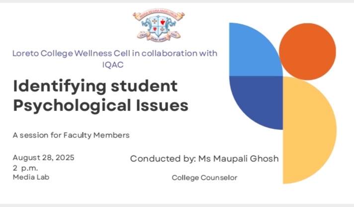 On August 28, 2025 the Wellness Cell of Loreto College organized a session on "Identifying Student Psychological Issues" for faculty members to enhance their understanding of the psychological challenges faced by students. The session was conducted by Ms. Maupali Ghosh, Clinical Psychologist and Counselor at Loreto College.