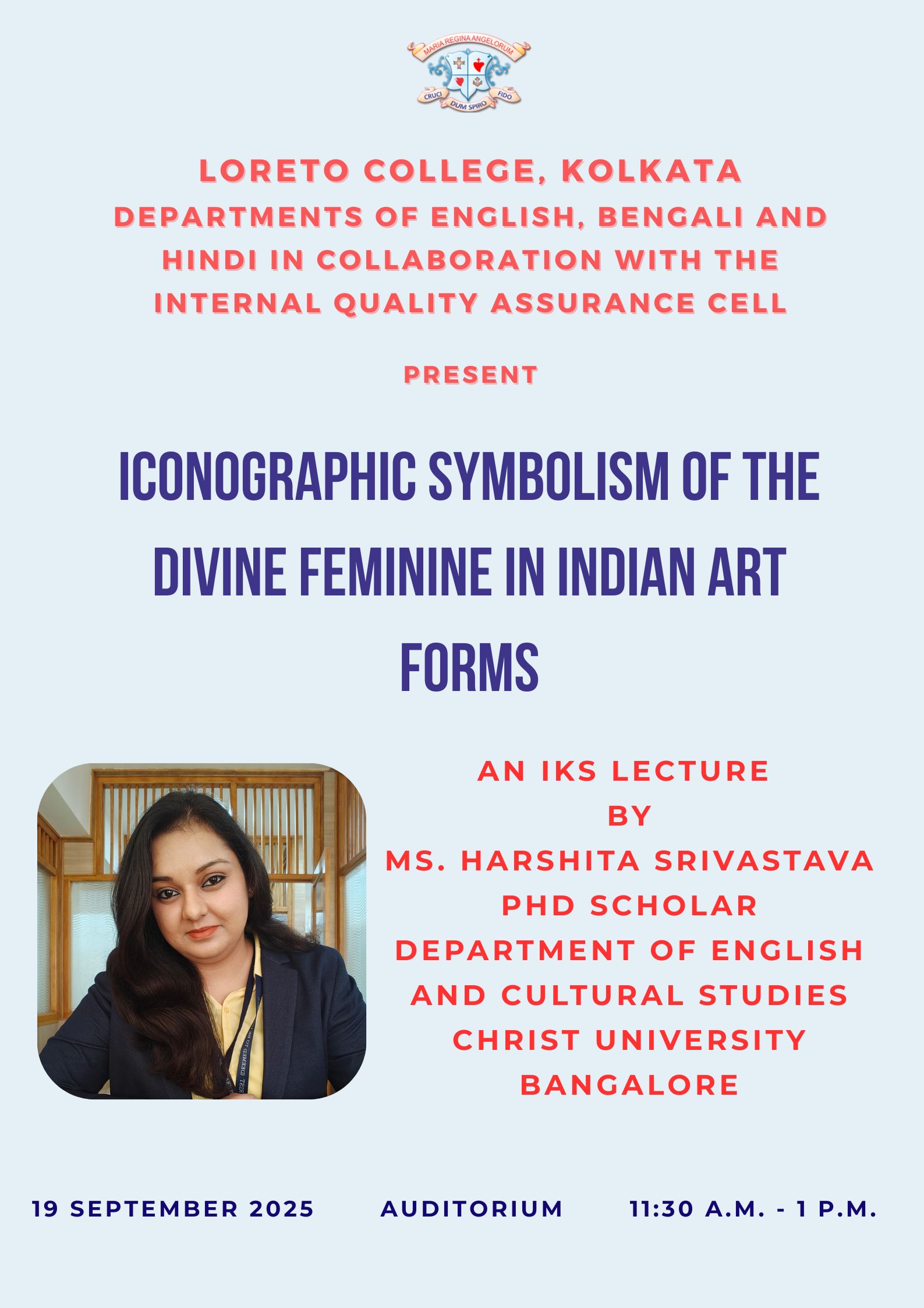As part of the IKS initiatives, the departments of English, Bengali and Hindi in collaboration with IQAC, Loreto College, organised a special IKS lecture by Ms. Harshita Srivastava, Doctoral Fellow, Department of English and Cultural Studies, Christ University and an alumna of the Department of English, on 19 September 2025. Titled "Iconographic Symbolism of the Divine Feminine in Indian Art Forms", the lecture traced the development and evolution of the iconographic representation of Indian Goddesses in paintings, sculptures and modern-day puja art forms observed in festivals. It also explored illustrated case studies of Shakta iconography (including temple art, paintings by secluded and understudied communities, popular art, and more), while also engaging students with hands-on interactive activities. The lecture was attended by the students of the English (PG and UG), Bengali and Hindi departments and the faculty members of the three departments.