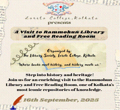 The Loreto College Library Society organized an educational visit for the students of Semester III and Semester V to the Rammohun Library and Free Reading Room on September 16, 2025. This year marks the 121st year of the Library and Free Reading Room. It was founded in 1904 to honor the exceptional reformer Raja Rammohun Roy. It is a remarkable center of Indian enlightenment, mental growth, and cultural growth. Great scholars and luminaries, including Gurudev Rabindranath Tagore, Acharya Jagadish Chandra Bose, Pandit Shibnath Shastri, and many more, have met and contributed to the resplendent history of this legacy. Students participated in a guided tour to the rare book section of the library and appreciated the invaluable delicate volumes of literature that had been saved for their future generations. A discussion on the censorship of intellectual literature and critic banned books was also conducted, stressing the lack of censorship in free thinking. The students also visited the Rammohun Museum, where they saw some of the rare currencies, coins, letters, and personal keepsakes of Raja Rammohun Roy. A feature of special interest was the revolving table used by the reformer himself, which provided a personal link to his extraordinary legacy. One of the students’ favorite activities was listening to the unique Manna Dey and many other archival recordings on the old record player. The library’s collection was enriched and highlighted through this engagement with folklore. The Festoons were carried out with a group picture that signified the essence of learning, togetherness, and value associated with this pioneering monument. This visit motivated students to develop an active interest in working with libraries as centers for information, history, and culture.