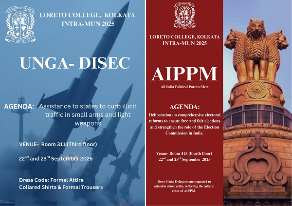 Loreto College, Kolkata, proudly hosted its first-ever Intra-Model United Nations (MUN) 2025, a two-day event held on 22nd and 23rd September 2025. The event aimed to foster diplomatic engagement, critical thinking, and leadership skills among students by simulating the proceedings of international and national deliberative bodies.