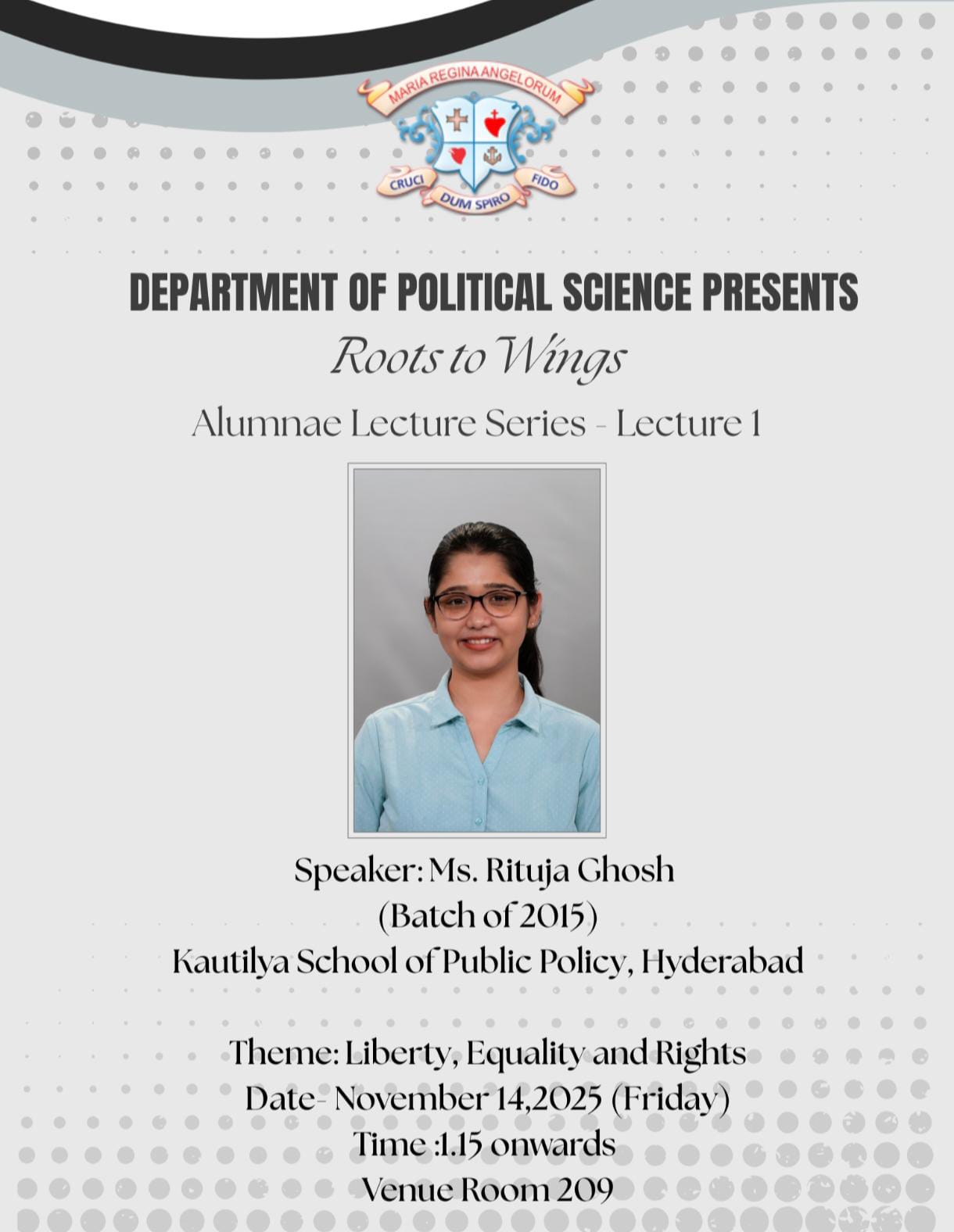 The Department of Political Science organized the first Alumnae Lecture under the annual departmental theme "Roots to Wings" for the Semester 1 students on November 14, 2025. The lecture was delivered by Ms. Rituja Ghosh, an alumna of the Batch of 2017, currently associated with the Kautilya School of Public Policy.