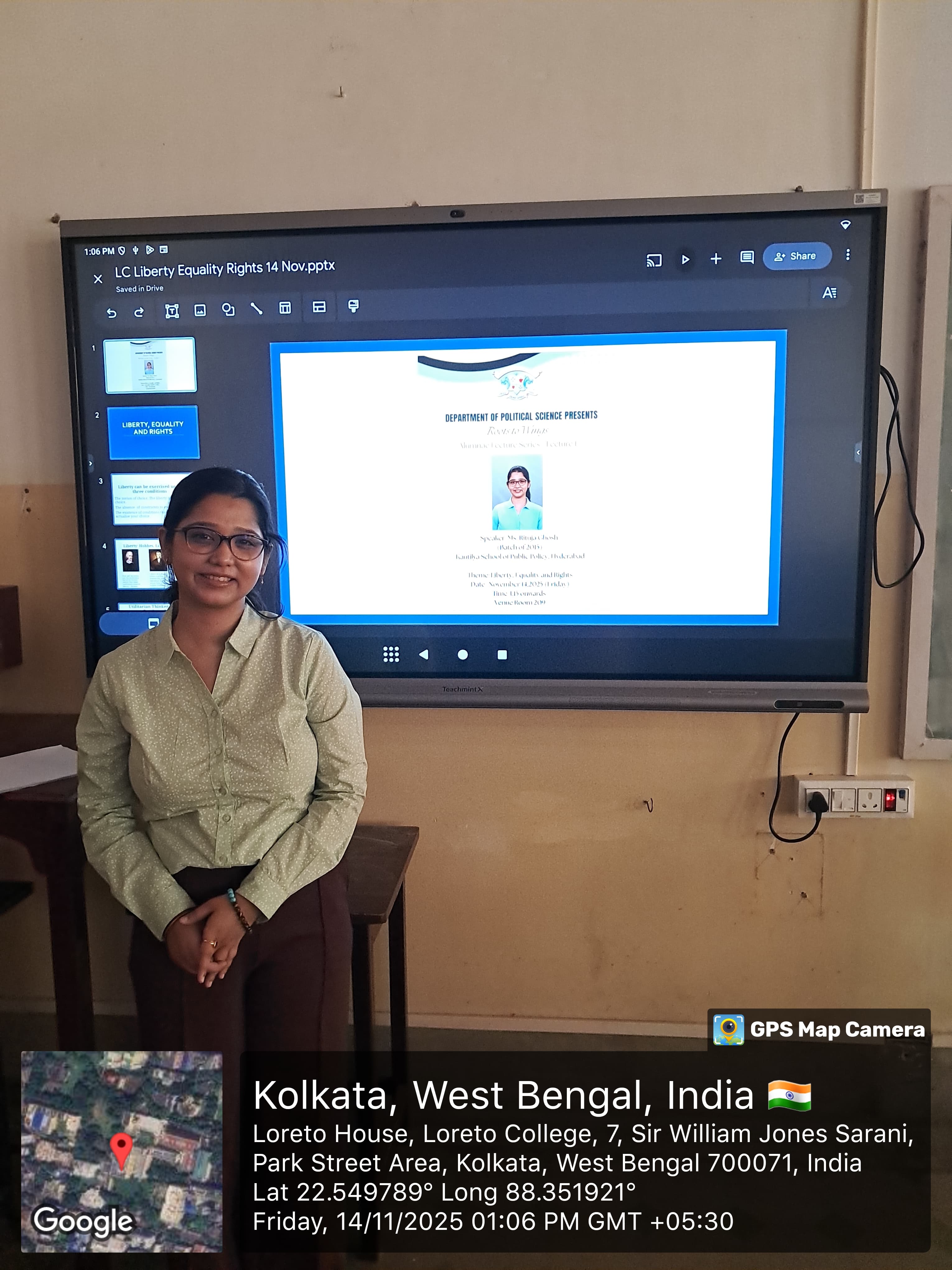 Ms. Ghosh spoke on the theme "Liberty, Equality and Rights", offering both conceptual clarity and contemporary relevance of these foundational political ideas. She also shared valuable insights into her academic and professional journey after graduating from Loreto College, highlighting the importance of interdisciplinary learning, research exposure, and leadership skills in shaping a career in public policy.