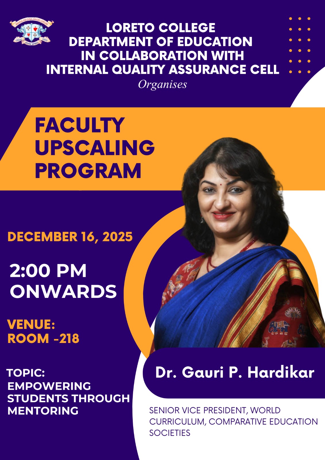 The Department of Education, Loreto College, in collaboration with the Internal Quality Assurance Cell (IQAC), successfully organised a Faculty Upscaling Program on 16th December 2025 at 2:00 p.m. onwards in Room 218. The session was conducted by Dr. Gauri P. Hardikar, Senior Vice President, World Curriculum, Comparative Education Societies, on the topic "Empowering Students through Mentoring". The programme aimed to enhance teachers’ understanding of mentoring as a vital academic and emotional support mechanism in higher education. A total of six teachers from the Department of Education actively participated in the session. The discussion was highly informative and interactive, focusing on the concept of mentoring, its significance in student development, and the different types of mentoring practices. Dr. Hardikar enriched the session by discussing real-life cases, enabling participants to reflect on practical challenges and effective mentoring strategies. The outcome of the programme was a deeper understanding among the faculty members of structured and need-based mentoring, equipping them with insights to support students more effectively in their academic, personal, and professional growth. Overall, the programme proved to be intellectually stimulating and professionally enriching, contributing meaningfully to faculty development and teaching-learning enhancement.