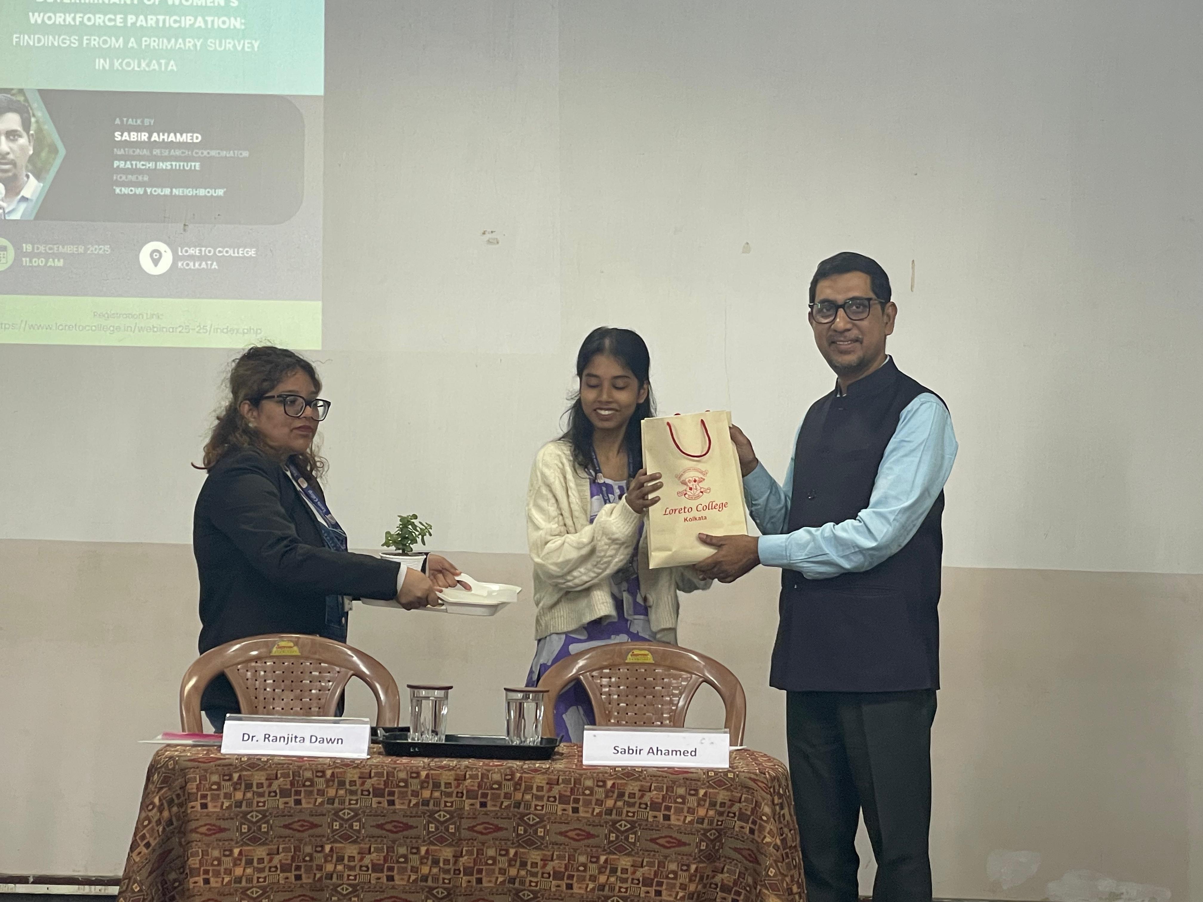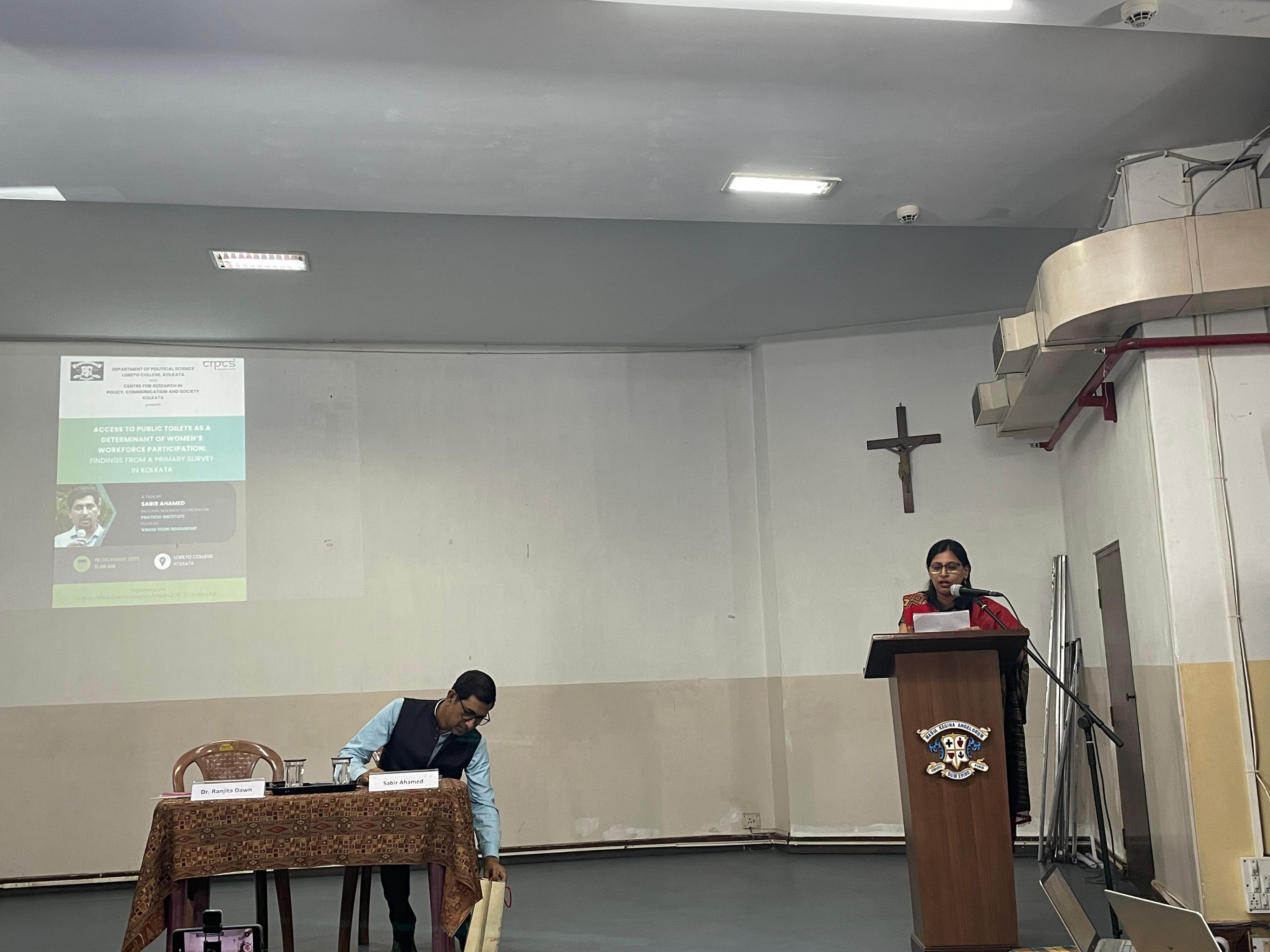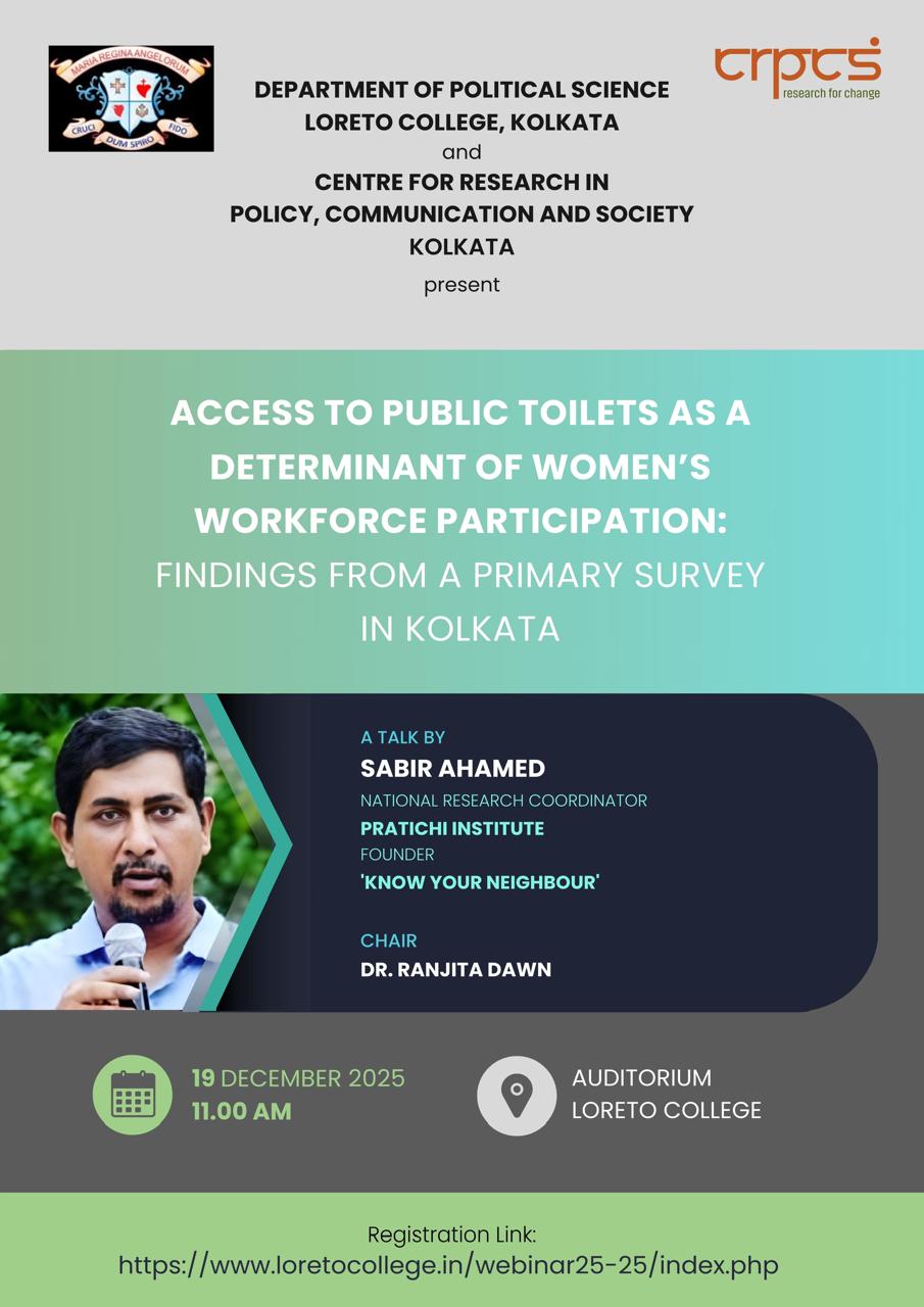 The Department of Political Science, Loreto College, Kolkata, in collaboration with the Centre for Research in Policy, Communication and Society (CRPCS), Kolkata, organized a seminar titled "Access to Public Toilets as a Determinant of Women's Workforce Participation: Findings from a Primary Survey in Kolkata" on 19 December 2025 at 11:00 a.m.