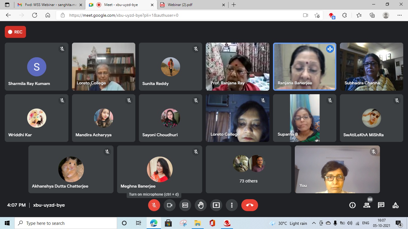 Women’s Studies Society of the college had organized a Panel discussion on Gender Dynamics in Disaster Risk and Resilience on October 5, 2021. The programme was conducted over Google Meet. The panelists were Prof. Subhadra Channa, now retired faculty of the Department of Anthropology, Delhi University and Dr. Sunita Reddy, Associate Professor, Centre of Social Medicine and Community Health, School of Social Sciences, Jawaharlal Nehru University. The panel was moderated by Ranjana Ray, Professor Emeritus, Department of Anthropology, University of Calcutta. The session highlighted the various aspects of disasters in the rural, urban context, and the inherent gender-gaps in risk, resilience, redressal systems and conditions around the social functions of gender. The panelists put forward their opinions and views with cogent examples and it was well-underpinned by the moderator. The question-answer session at the end was bright with enthusiastic interaction between the speakers and the audience. The Women’s Studies Society plans to do multiple such short panel discussions in future, that can focus on pertinent social/gender-based issues and add to the general awareness of the academic community of students and faculty of the institution.