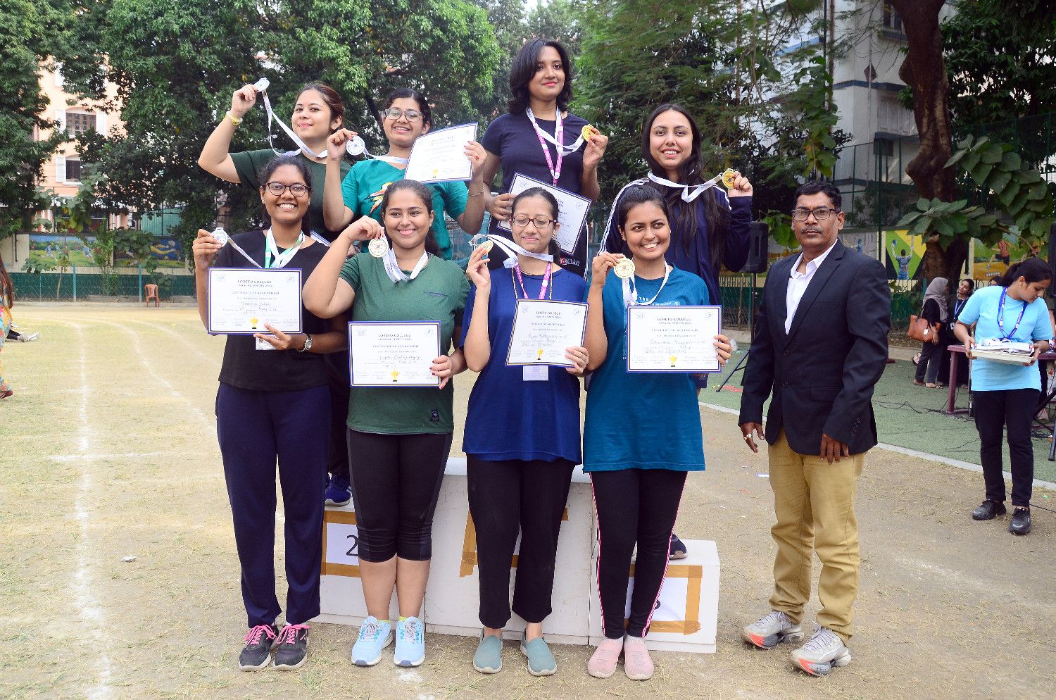 The Loreto College Annual Sports Day, organised by the Games Society and held on November 23, 2024 at the St. Xavier’s Collegiate School Ground (Primary Section), was an exhilarating display of athleticism and team spirit, drawing an enthusiastic crowd of students, faculty, alumni, and parents. The event was marked by the presence of eminent guests: Chief Guest Ms. Madhu Kumari, International Basketball Player; Father Roshan Tirkey, Principal, St. Xaviers’s Collegiate School, Kolkata; Sr. Powlin, Community Leader and Secretary to the Loreto House Education Society; Mr. Soumitra Chowdhury, ex-basketball player and coach; and Sr. Dr. A. Nirmala, Teacher in Charge, Loreto College.