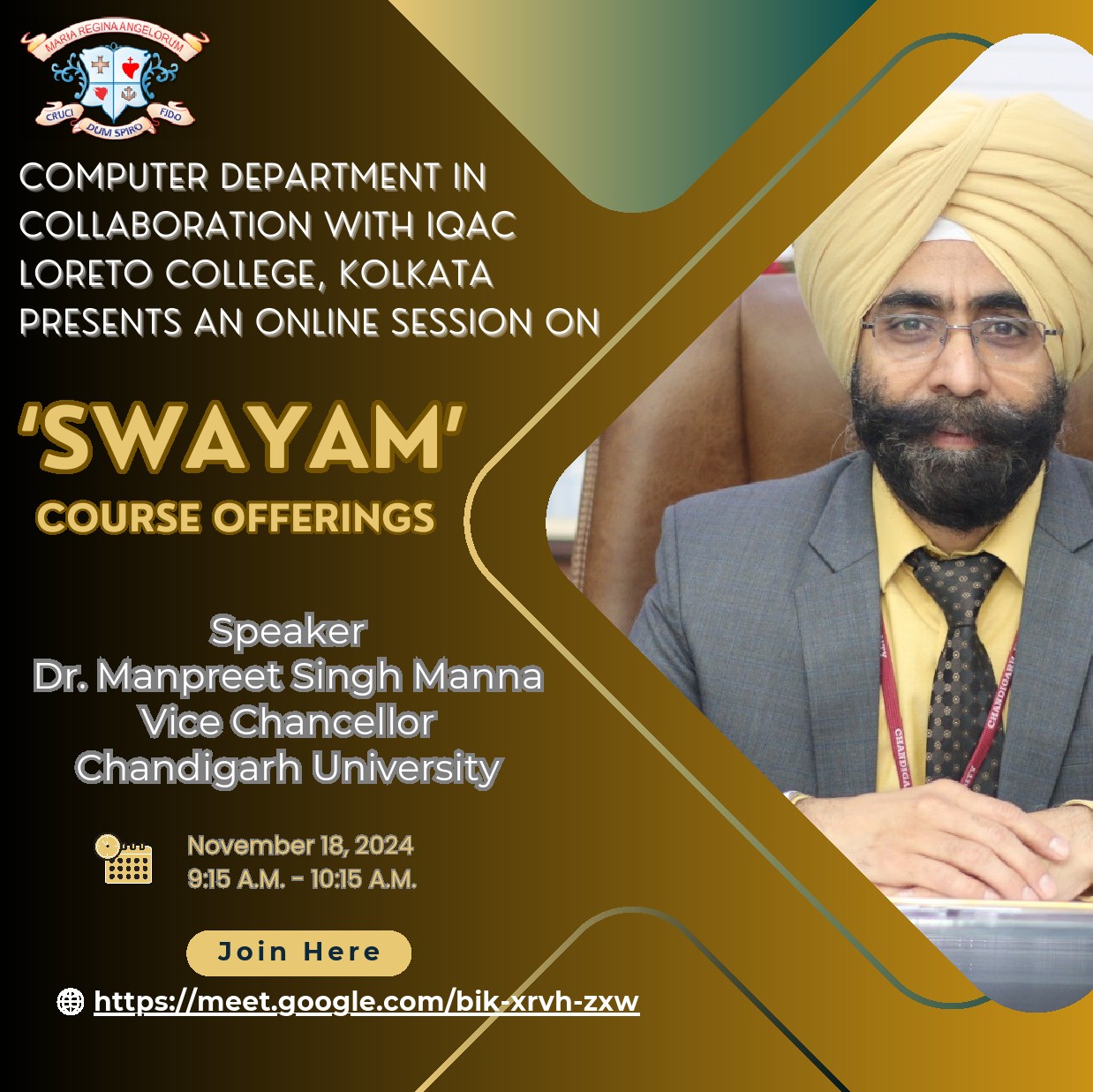 A talk on online courses available through SWAYAM was organised by the Computer Department in collaboration with the Internal Quality Assurance Cell (IQAC) on November 18, 2024. The session was conducted online. The speaker for the event was Dr. Manpreet Singh Manna, Vice Chancellor of Chandigarh University. The audience comprised students, faculty members, and administrators keen to understand the potential of online learning platforms.